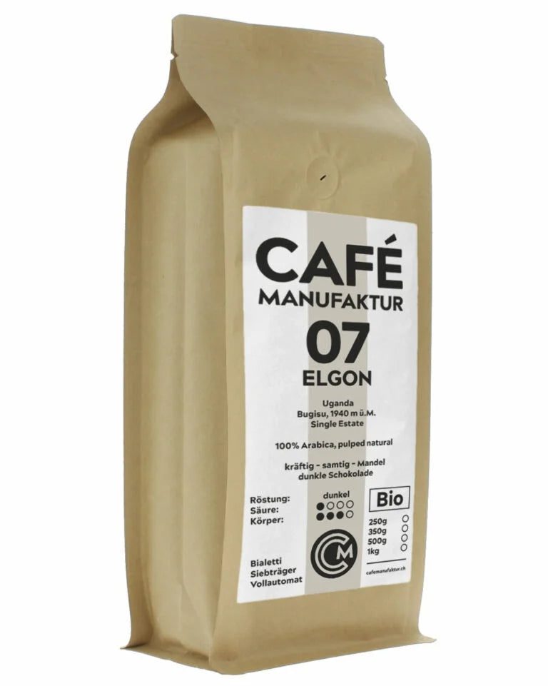 Dieser Single Estate kommt von einer kleinen Farm in der Region Bugisu am Mount Elgon. Die Familie Nicanoli startete 1989 mit dem Kaffeeanbau. Nebst Kaffee gibts noch Bananen, Bohnen und drei Kühe auf dem Hof. Alles sehr familiär. Die dunkle Röstung ist erste Wahl für Espresso Lovers. Elgon, ein eleganter Arabica, wird auf der kleinen Farm der Familie Nicanoli am Mount Elgon in Uganda angebaut. Durch die langsame, dunkle Röstung entwickeln sich seine kräftig-samtigen Mandel- und Schokolade-Aromen – ein Genuss für Espresso-Fans und Liebhaber von charaktervollen Espresso-Getränken mit Milch. Optimale Ergebnisse werden in der Bialetti, im Vollautomaten oder im Siebträger erzielt.