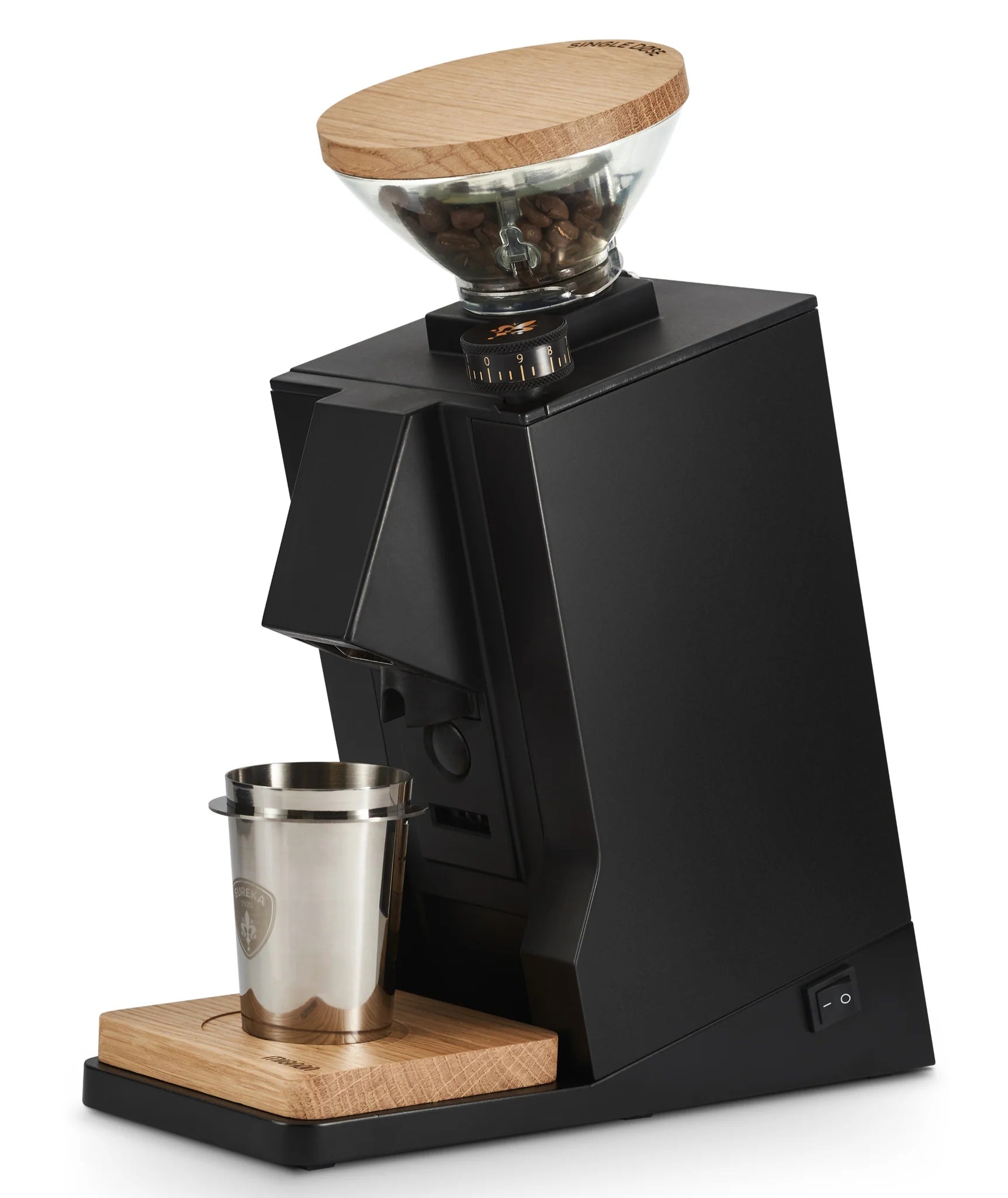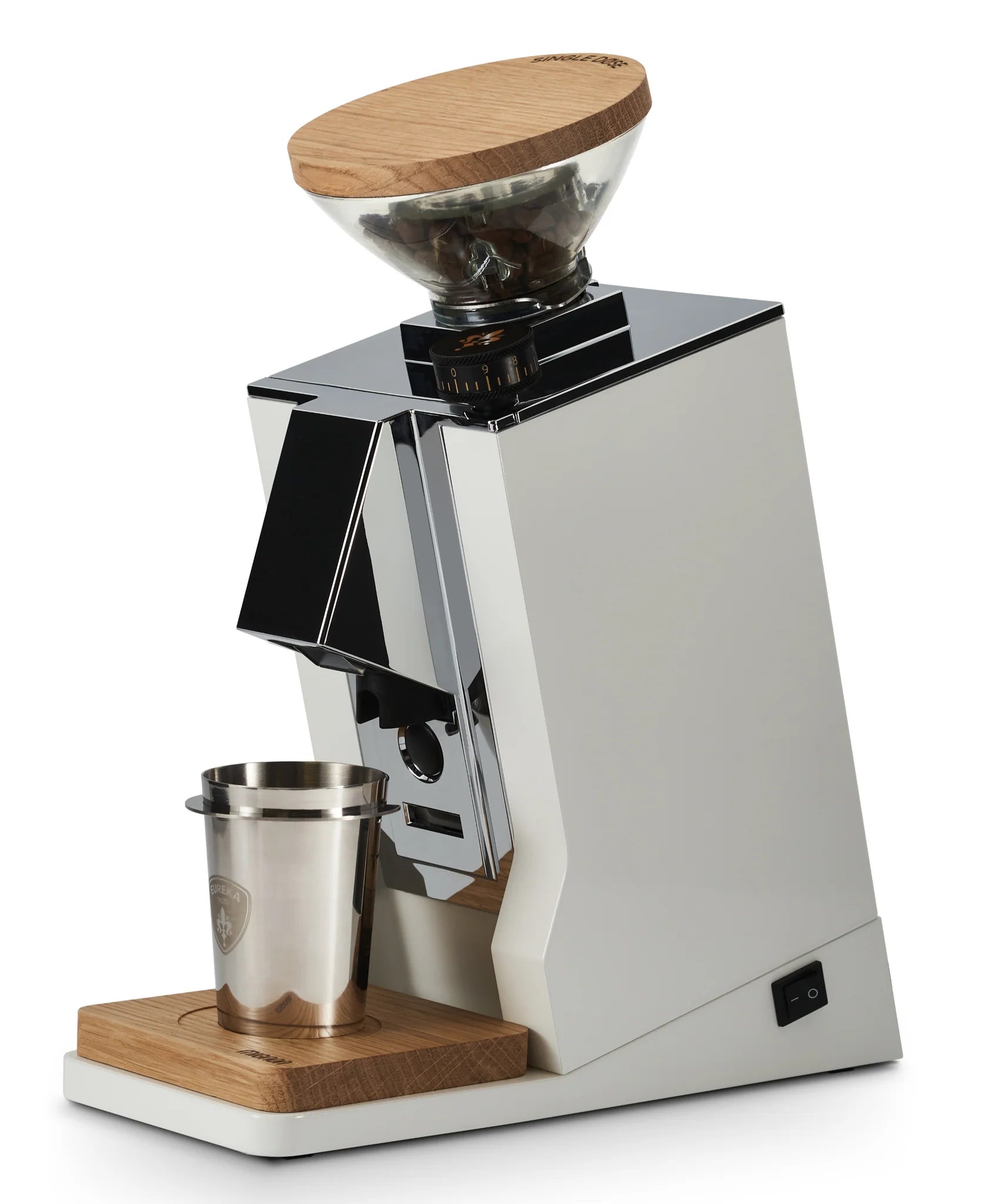 - Neuer Single Dose-Bohnenbehälter mit Eichenholzdeckel (45 g) und drehbarem Metallschieber.
