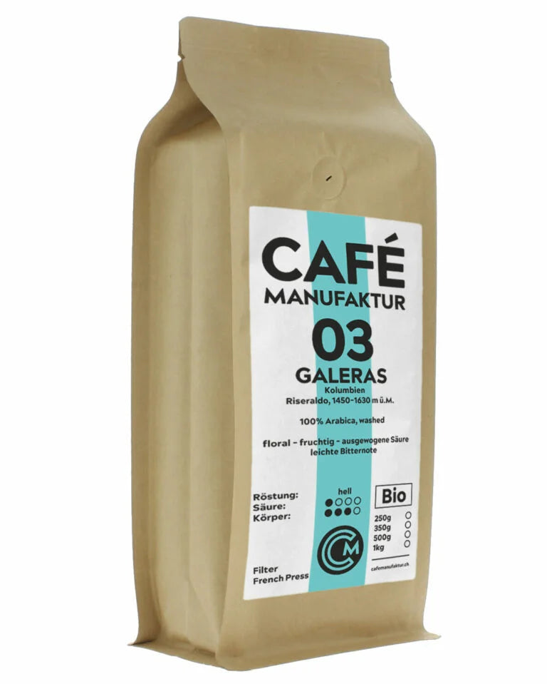 Milde Säure und rund im Geschmack. Wir rösten den Galeras eher hell und empfehlen ihn für alle Filter Zubereitungen. Galeras ist ein dezenter Arabica aus der Region Risaralda, Kolumbien. Die Bohnen werden hell geröstet und eignen sich mit ihrer milden Säure für alle Zubereitungen mit Filter oder French Press oder für einen sanften Lungo.
