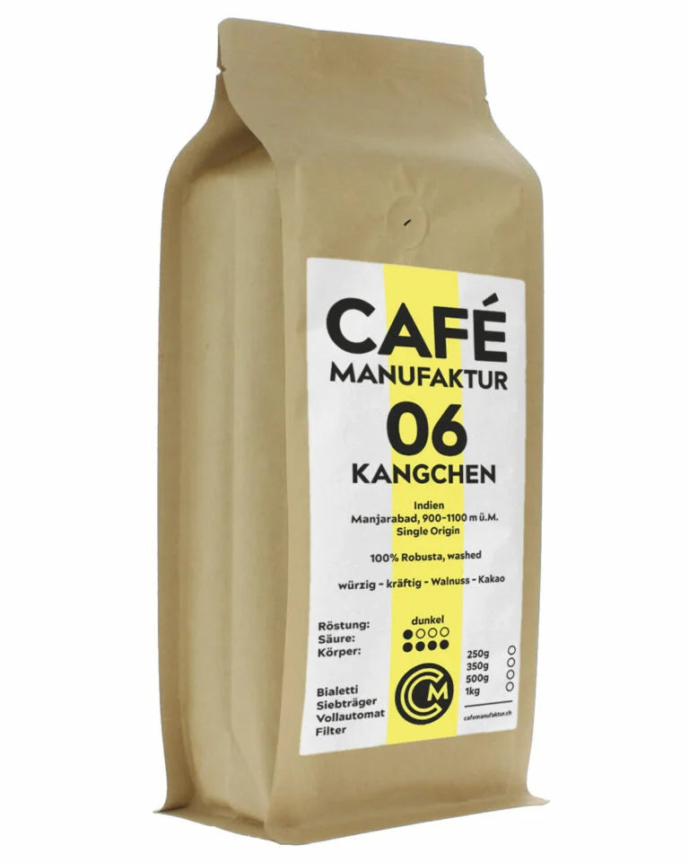 Kangchen, ein charaktervoller, würziger Robusta, stammt aus Indien, Region Manjarabad. Besonders für diese Gegend ist der Kaffee-Anbau im zweistufigen Mischschatten, der oft mit Gewürzen und Obstkulturen vermischt ist. Die Bohnen werden von uns dunkel geröstet und eignen sich für kräftige Espressi.